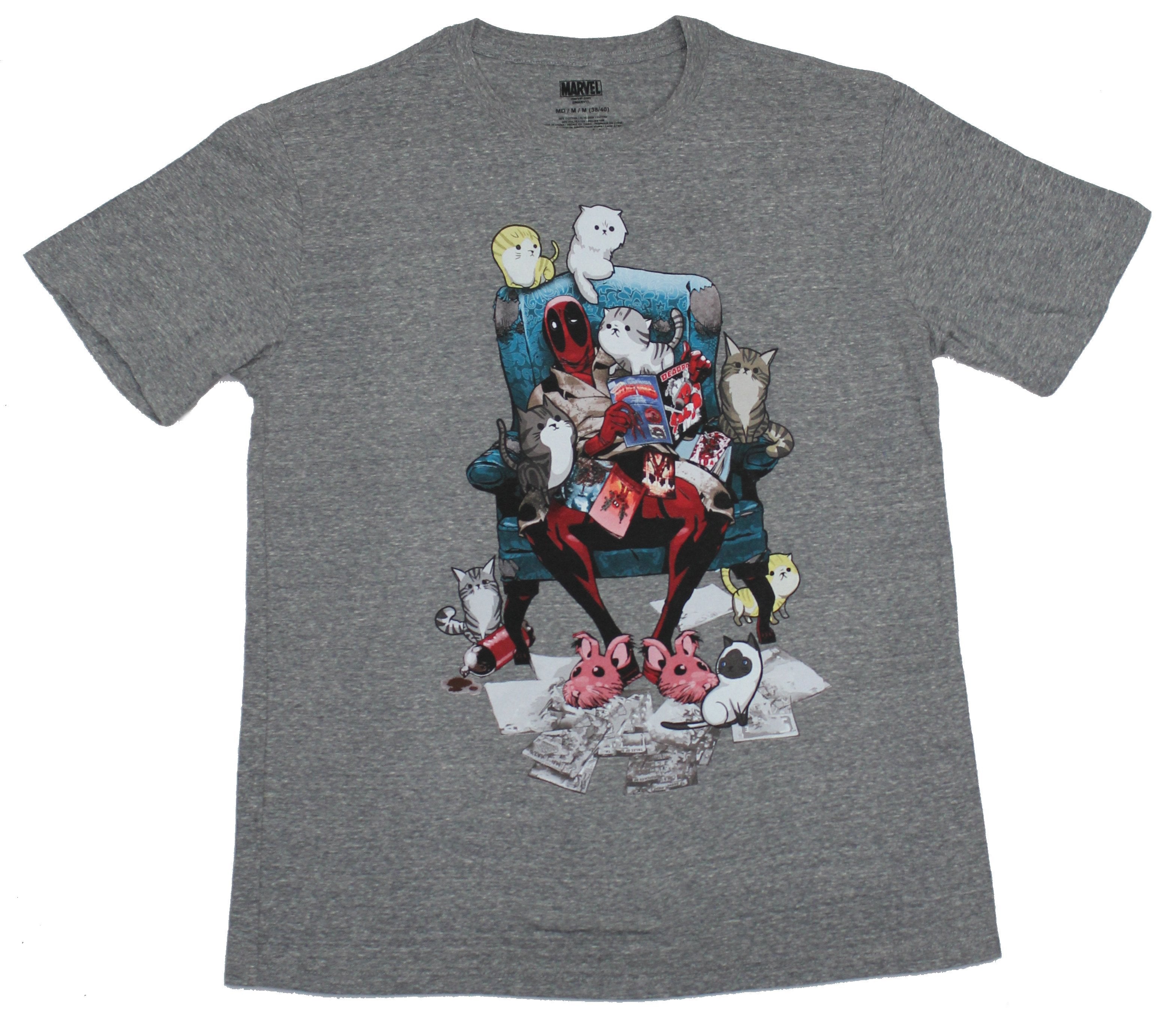 Deadpool (Marvel Comics) Mens T-Shirt - Deadpool Easy Chair Kitty Comic Pile